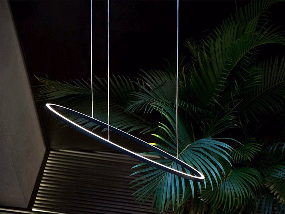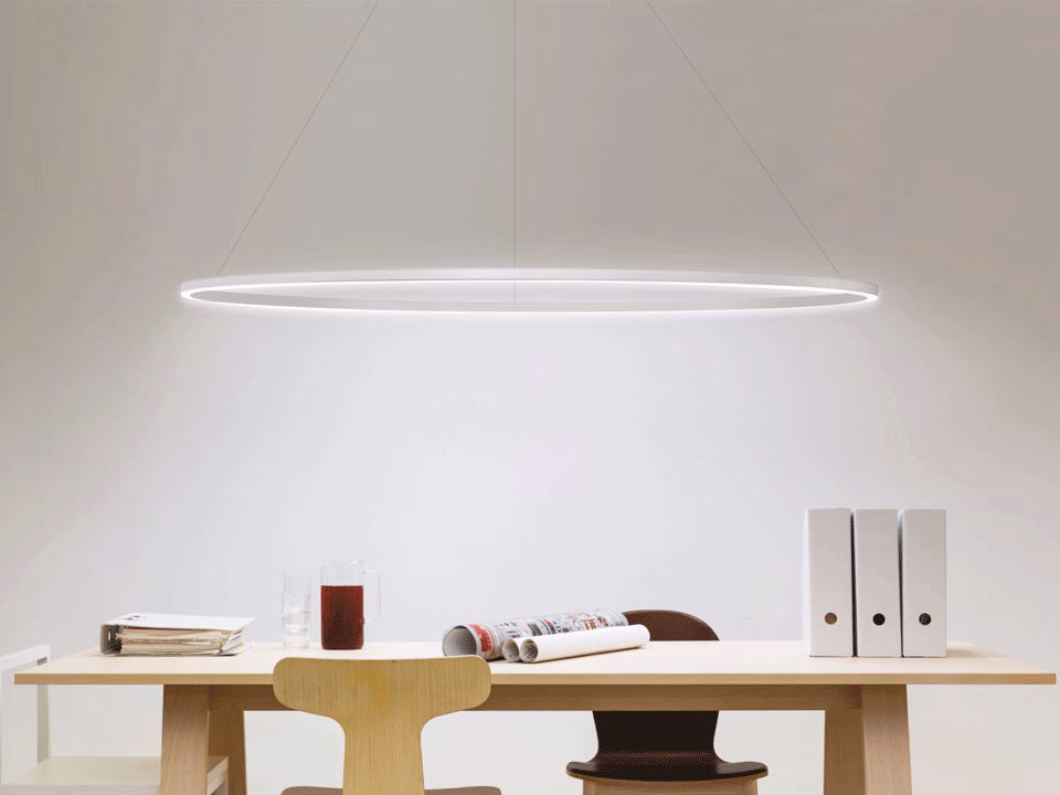 Collection of LED pendants, floor/wall lamps available in different versions: major, minor, double, triple and mega provides a direct or indirect diffused light. Equipped with an opal diffuser. The lamps are made using a proprietary extrusion coupling technology. Ellisse Major is also avalaible as floor or wall versions and is provided with a black marble base or a wall hook accessory.