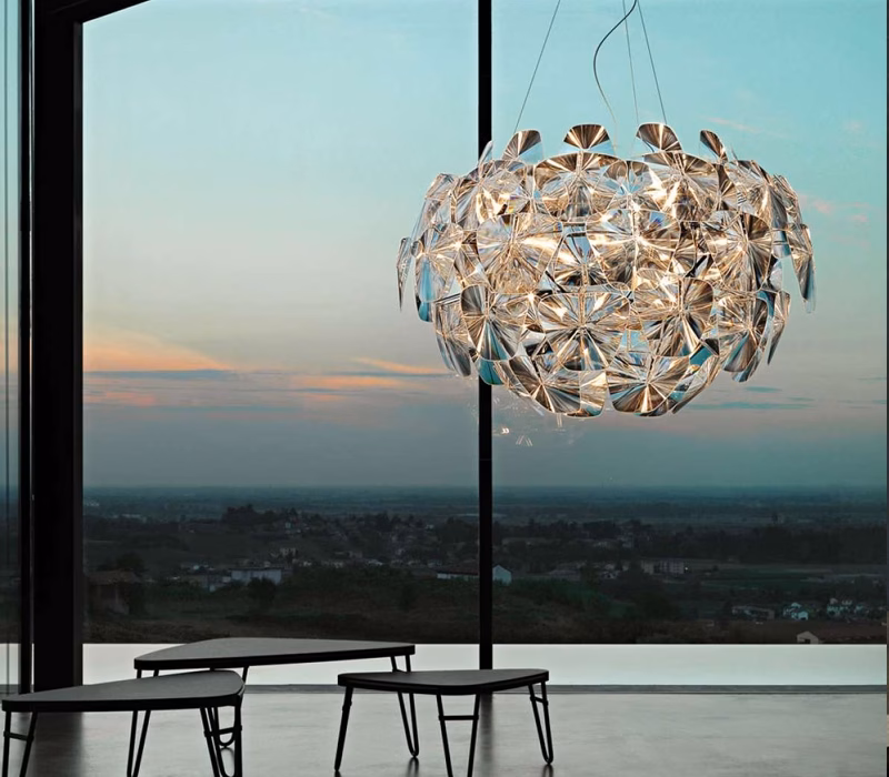 Incredibly light and easy to dismantle, Hope revives the magic of traditional chandeliers, reinterpreted with sophisticated modern technologies and contemporary materials. The thin polycarbonate Fresnel lenses multiply the light, creating a pleasant, sparkling and festive atmosphere.