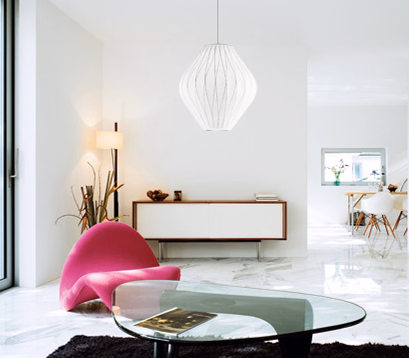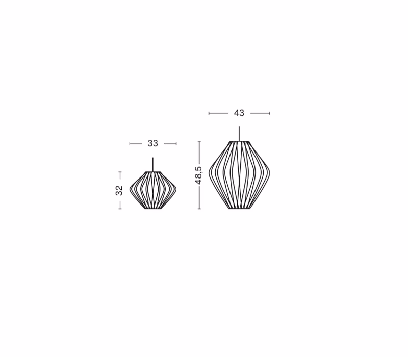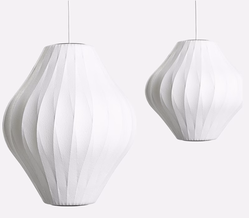 Part of the Nelson Bubble Lamp series, the Nelson Pear Bubble Pendant has a pear shape that flares towards the center, with crisscrossing lines in the understructure that accentuate its curves. George Nelson originally designed the Bubble Lamp series in 1952. He was inspired by a set of silk-covered Swedish hanging lamps.