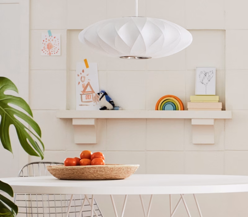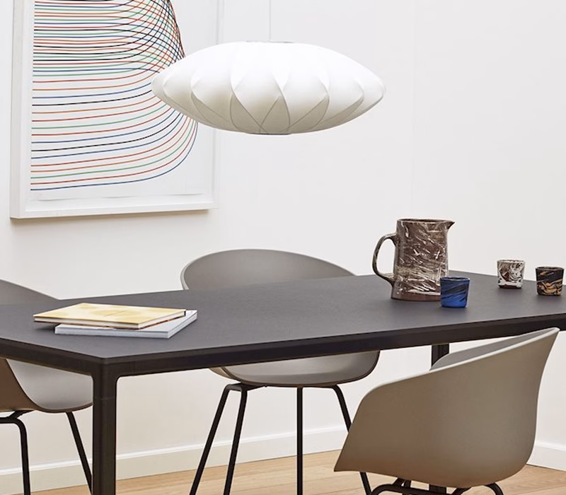 The Nelson Saucer Crisscross Bubble Pendant is part of the Nelson Bubble Lamp series. Inspired by a set of silk-covered Swedish hanging lamps, George Nelson designed the series in 1952. Beyond the soft light this lamp casts, it features a unique crisscross pattern that adds an interesting contour to the shade.