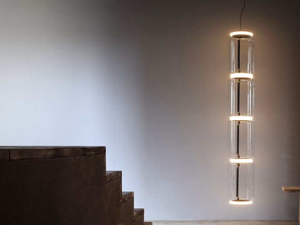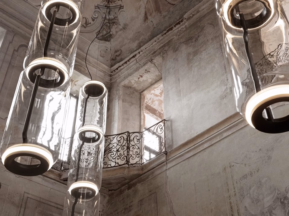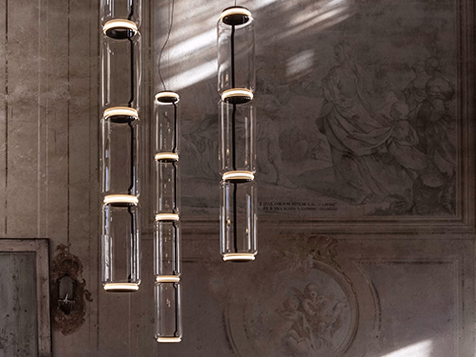 • Hanging lamps consisting of interconnecting glass modules reaching a length of 3,2 mt. (126.77″) with 4 mt. (157.48″) suspended power cable. Cylindrical and semi-spherical transparent blown glass structure, suspended die cast aluminium ring connector, hydroformed steel internal lateral arm and injection moulded optical opal silicone outer ring diffusers.