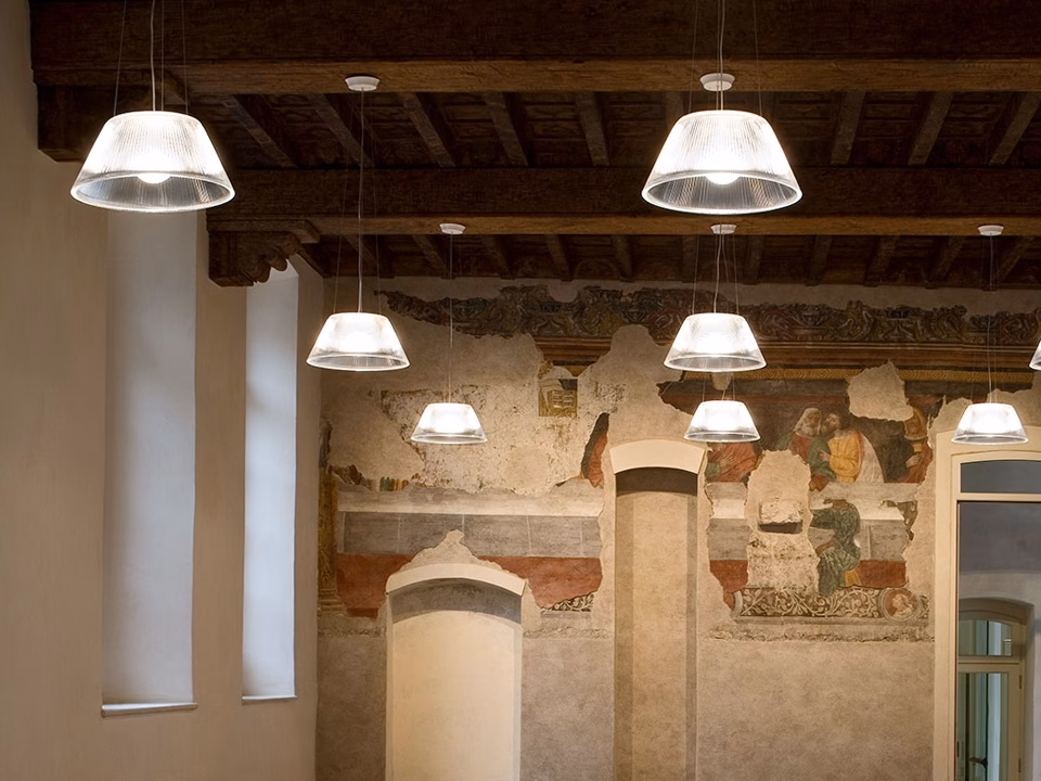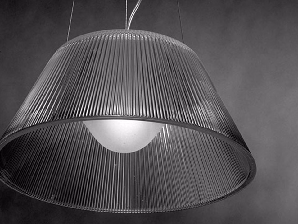 Suspension lamp providing diffused light. Acid-etched pressed borosilicate glass internal diffuser. Pressed clear glass shade. Injection-molded transparent polycarbonate diffuser support. Transparent, stamped polycarbonate dust protection screen. White, injection-molded ABS rose, galvanized pressed steel ceiling fitting.