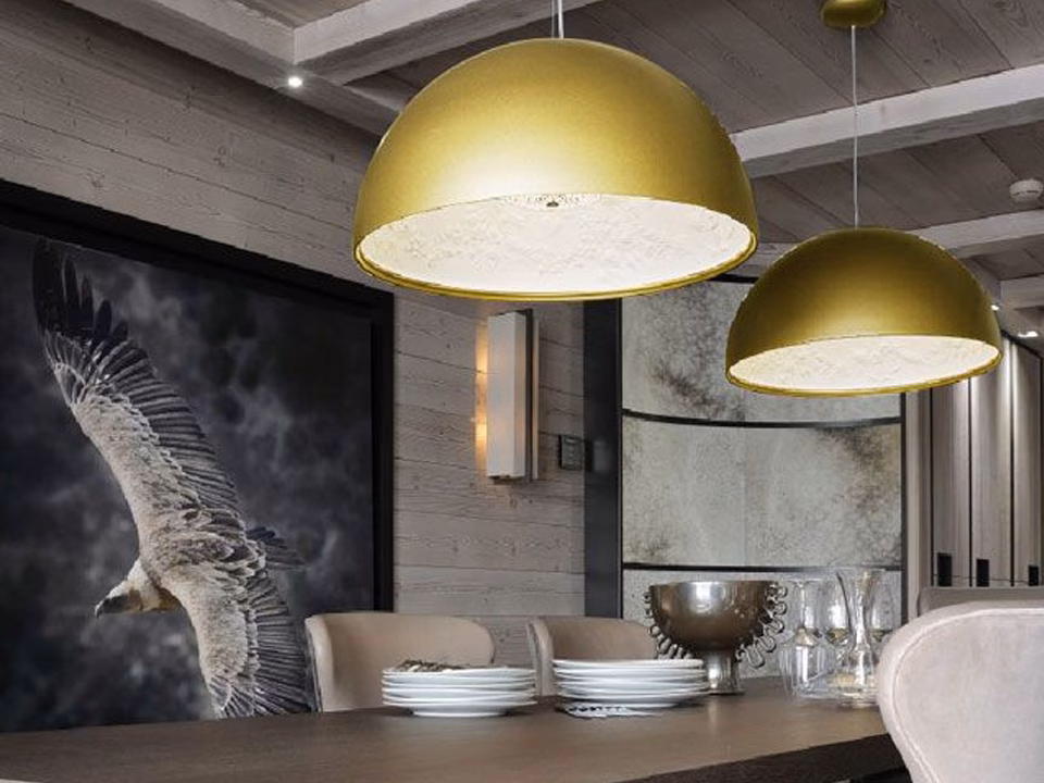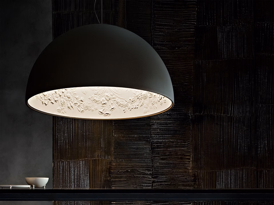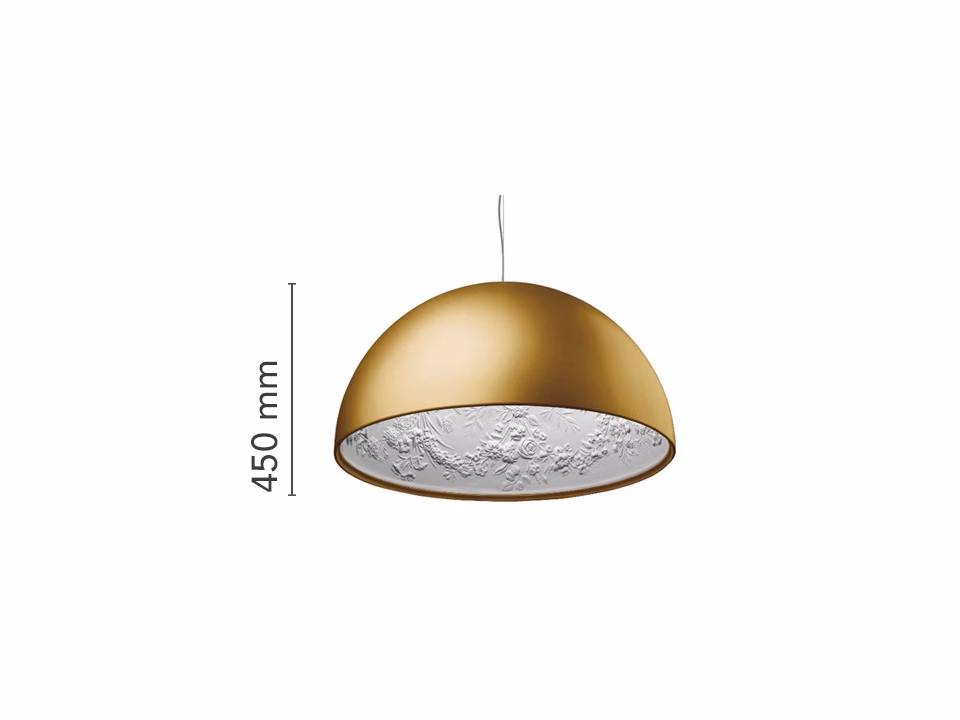 Suspension luminaire providing diffused lighting. Hemispherical, mechanically-processed cast plaster diffuser, painted white inside. Outer finish: rust, glossy black, glossy white or matte gold. Plaster diffuser support in die-cast aluminum alloy. Upper cable gland and blocking ring nut in black injection-molded PC. Shaped, adjustment screws. Transparent, injection-molded, upper and lower silicone shock absorbers.
