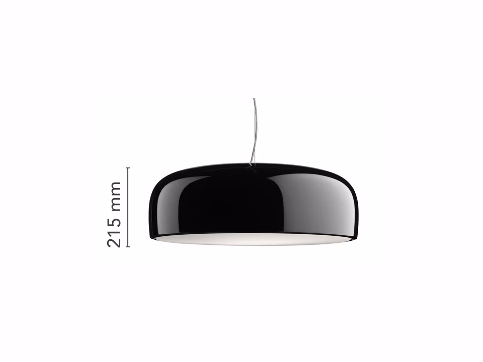 Suspension lamp with direct light. Aluminium body. Available in gloss black, white or MUD. Injection-moulded opalescent methacrylate diffuser. Steel ceiling attachment with steel suspension cable, 5 pole electric cable in PTFE double insulation, working length 400 cm.