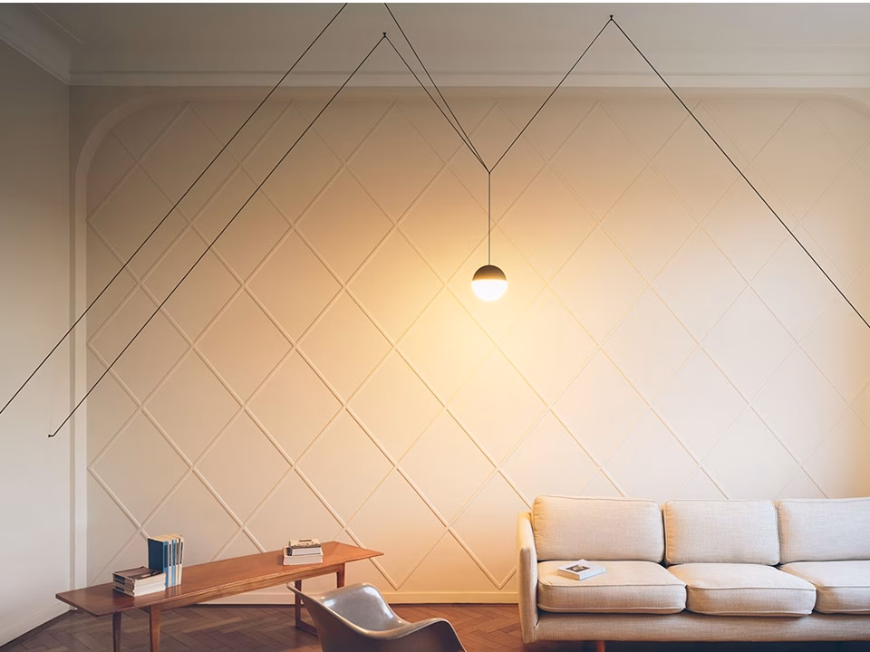 Suspension lamp providing diffused light. Matt black varnished die-cast aluminium body coated with clear soft-touch varnish. Optical diffuser in opal PC. Suspension system of 12 and 22 metres with Kevlar reinforced coaxial cable.