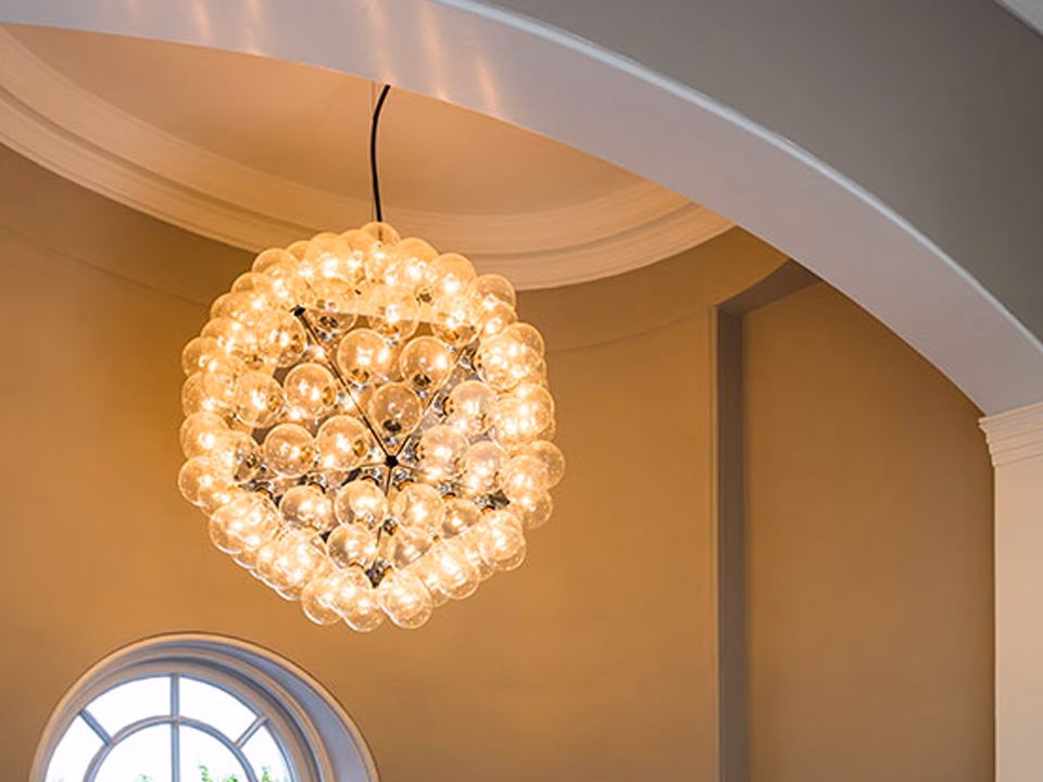Suspension fixture providing direct and reflected lighting. Structure formed by 20 pressed, polished aluminum triangles. 120 clear Globolux lamps housed around the structure. Steel ceiling fitting and rose.