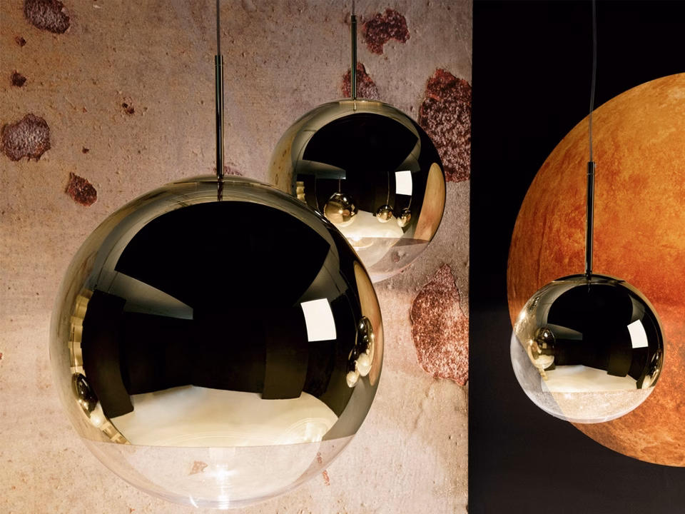 One of the most identifiable Tom Dixon products, inspired by the famous space helmet, and by disco balls. Mirror Ball is lightweight yet robust and reflects its environment, projecting downward ambient light. Available in the original chrome finish, and in gold, with two different designs; pendant and tripod stand, this versatile collection offers a lamp for every function.