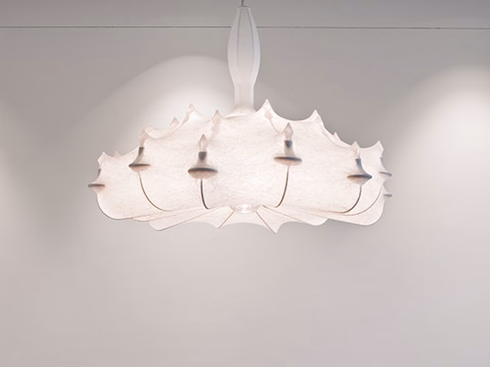 Suspension lamp providing diffused lighting. White powder coated internal steel structure sprayed with a unique “cocoon” resin to create the diffuser which is then protected by a transparent sprayed on finish.