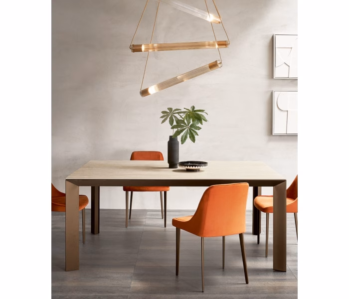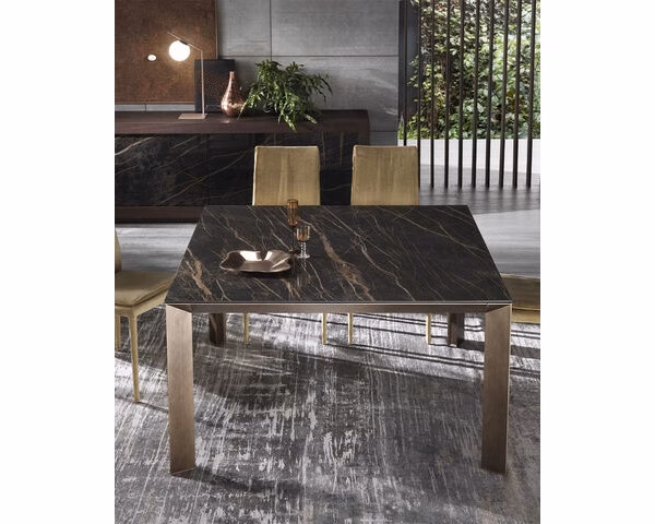 The solid Manhattan table features modern design with structure and legs in matt lacquered or painted aluminium in different colours. Also available on hand-brushed finish. Available with a 6 mm thick ceramic top in a choice of finishes, rectangular or square, fixed or extending. The extending version has an easy to use, discreetly integrated system. In the rectangular format, the extensions are internal, except for the models with a 120 cm table top, which have external extensions with a bag. The extensions are housed inside rectangular tables, and provided separately for square ones, in a bag for storage (except in the case of the 140×140 model, which has internal folding extensions)