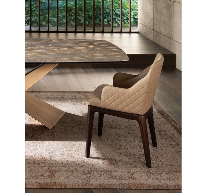 Two colour option: the Margot model is also available with front and back upholstered in the same fabric but in two different colours, achieving a contrasting pattern that oozes originality and personality. The version with quilting in Sahara eco-nabuk or Amalfi velvet behind the backrest gives the Margot chair an extra touch of refinement due to its softness and sartorial finish. The quilted backrest can be coordinated with the front and seat in any upholstery except leathers and imitation leather