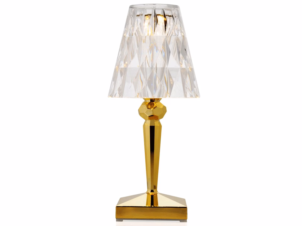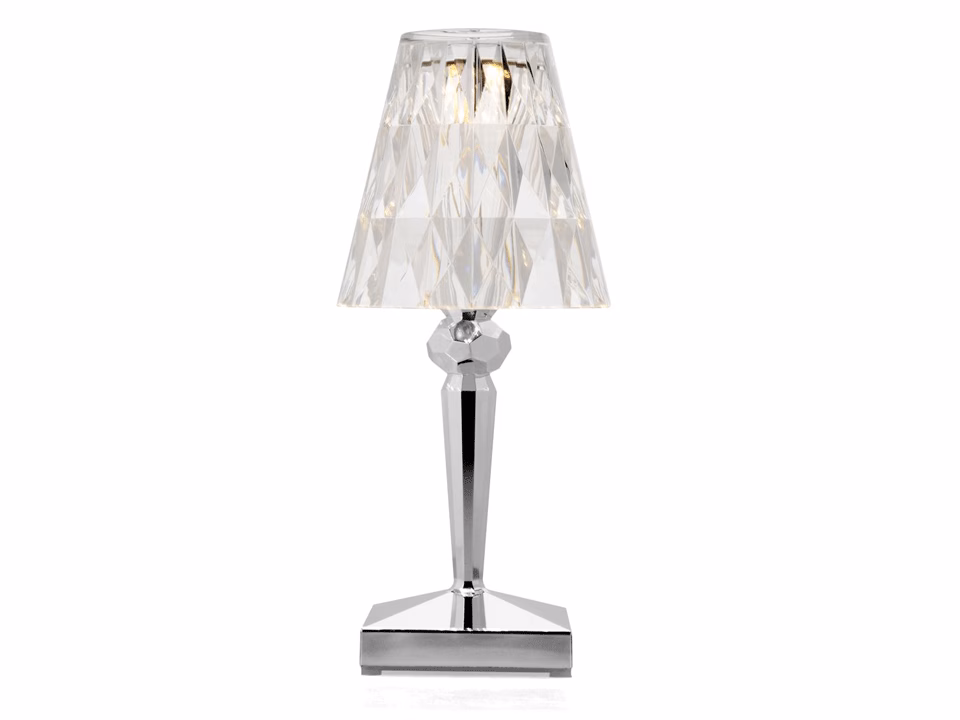 Battery is an iconic compact lampshade. It is made from transparent PMMA and truly embodies innovation, being 100% rechargeable when plugged in and with a battery life of up to 8 hours. This allows it to be moved around extremely easily: perfect for use in outdoor restaurants and cafés. Battery features a crystal-coloured shade with a prismatic surface that throws out enchanting patterns of light, and a structure made from three different sophisticated metallic colours.