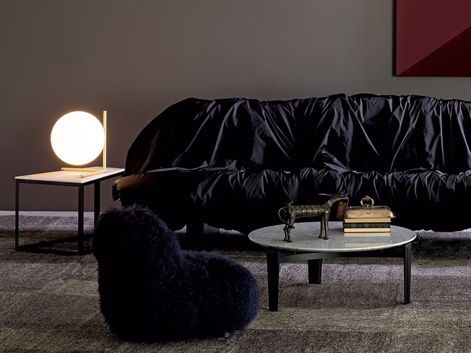 Table lamp providing diffused light. Frame in brass, brushed and transparent varnished or chrome steel. Blown glass opal diffuser. Dimmer on the power chord.