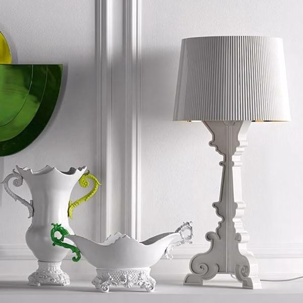 Bourgie unites classicism, wealth and tradition with technological innovation. The baroque-style base consists of three decorated elements that interlock, while the large shade is created with a pleated effect which creates a multitude of reflections when lit. Thanks to a special system used to hang the shade, three different heights can be obtained, altering them to suit personal preference, depending on the use to be made of the lamp: 68, 73 and 78 centimetres.