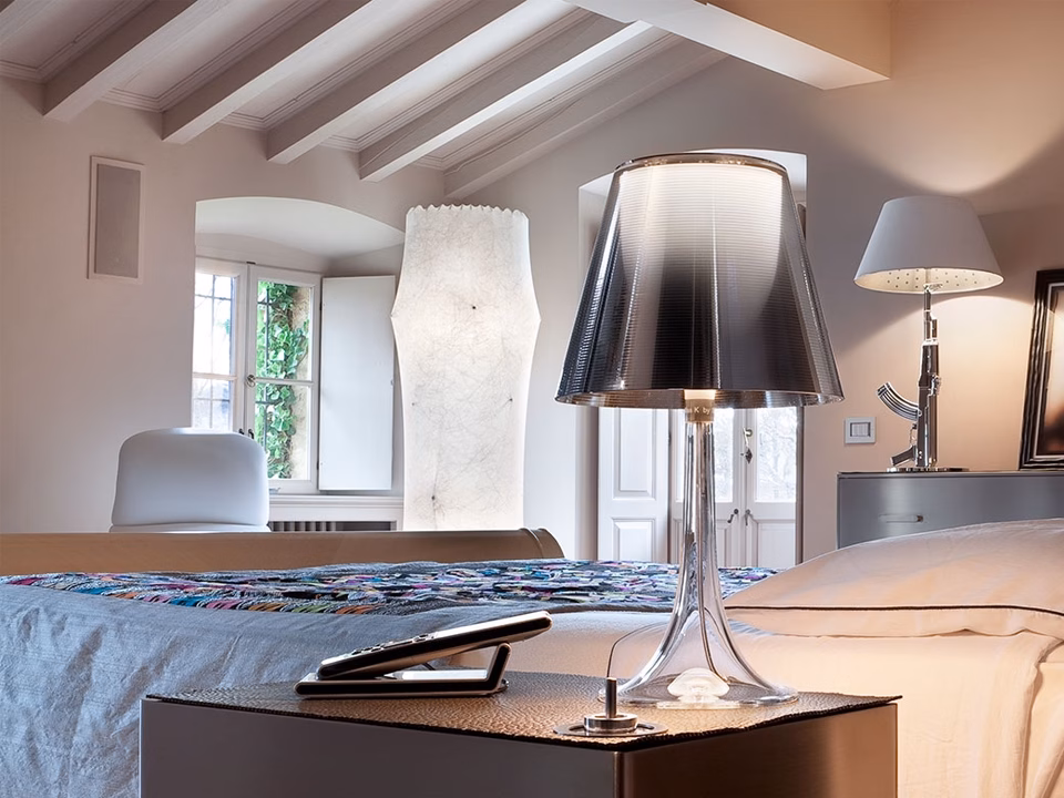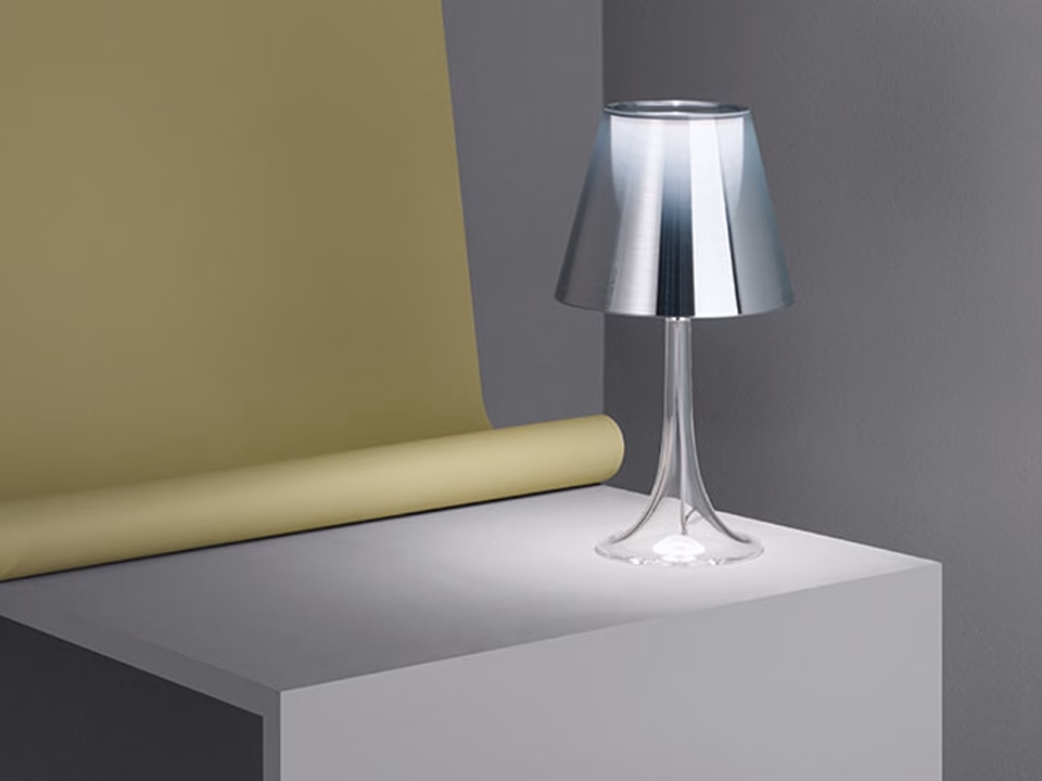 Table lamp providing diffused light. Fully transparent, injection-molded PMMA polymethylmethacrylate frame; opaline, injection-molded polycarbonate internal diffuser and injectionmolded transparent or colored polycarbonate external diffuser completely finished with high-vacuum aluminization process.