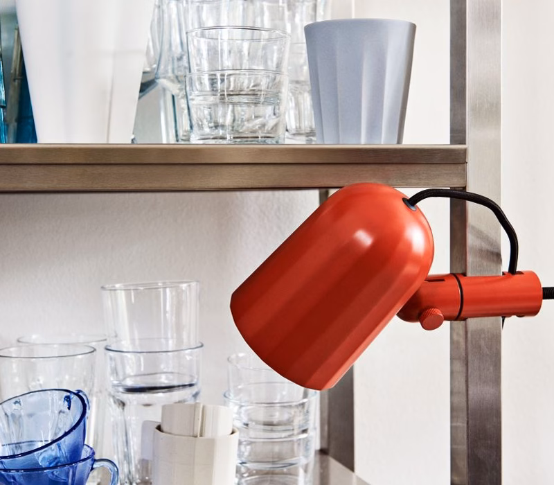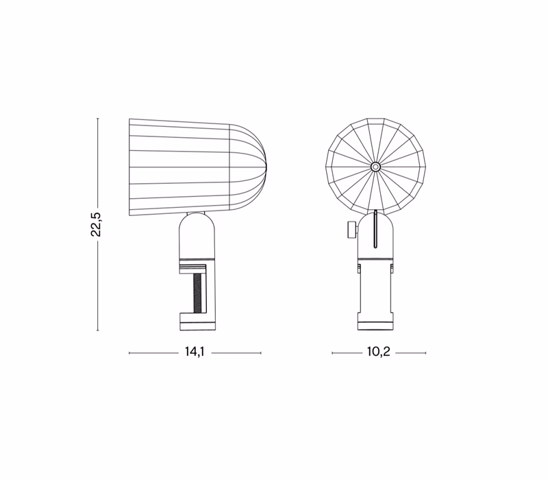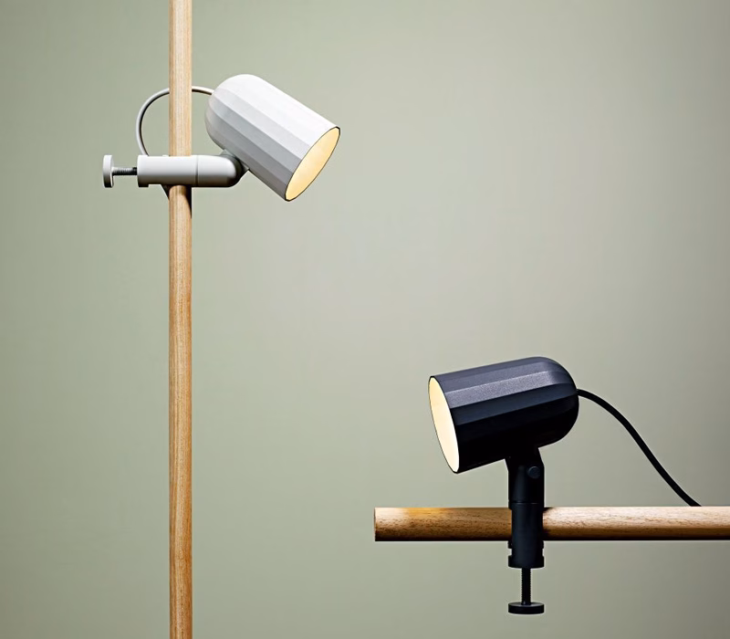 Noc is a universal clamp light with a faceted die cast aluminium shade. Its machined aluminium stem and clamp offers two points of adjustment and can be used on table tops, shelves and headboards