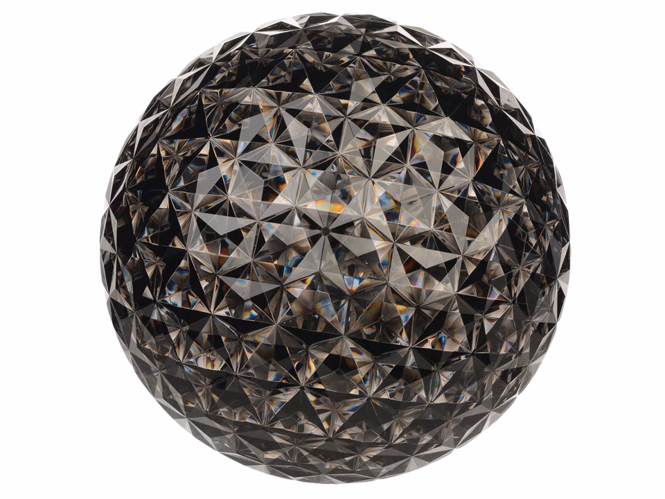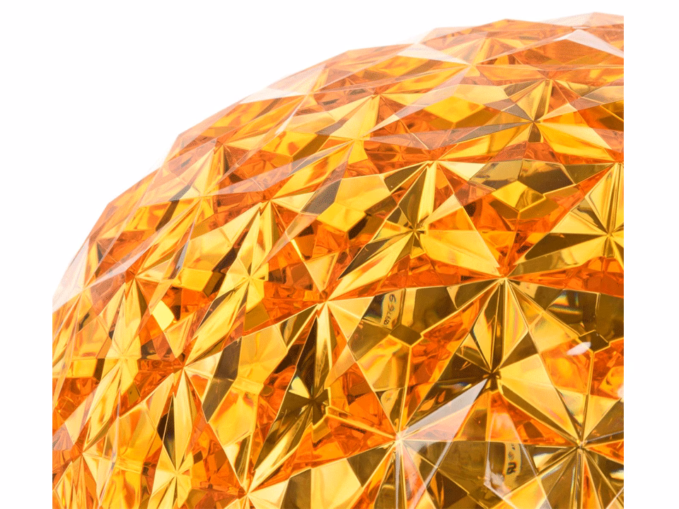 A complete family of lamps (pendants, low table lamps, and lamps with metal structures) its special feature is the shape of its slightly elliptical diffuser. Its transparent surface, which is many-sided both inside and out, creates a rich tapestry of reflections.