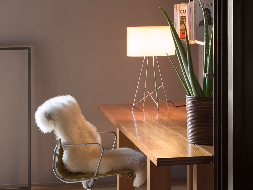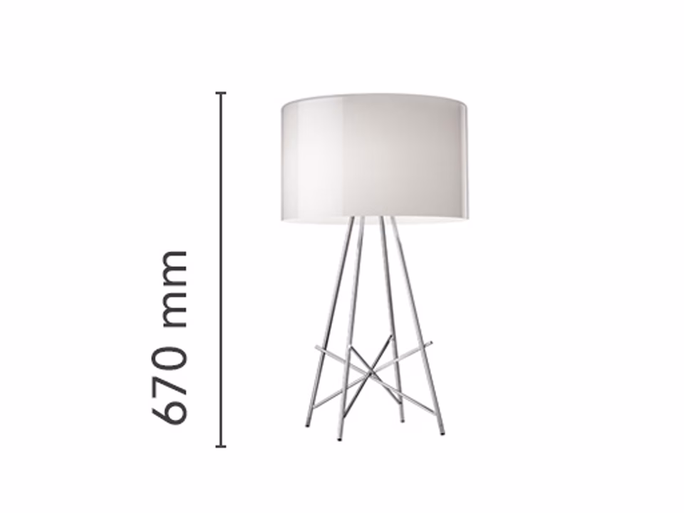 Table lamp providing diffused lighting. Steel tube (10 mm diam.) structure, welded, brushed and chrome-plated. Diffuser support disk in die-cast, polished and chrome-plated Zamak alloy. White injection-molded PA6 (nylon) lamp cover. Injection-molded PC (polycarbonate) inner diffuser in 3% opal color. Transparent injection-molded elastic PVC (polyvinylchloride) feet.