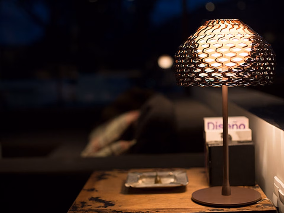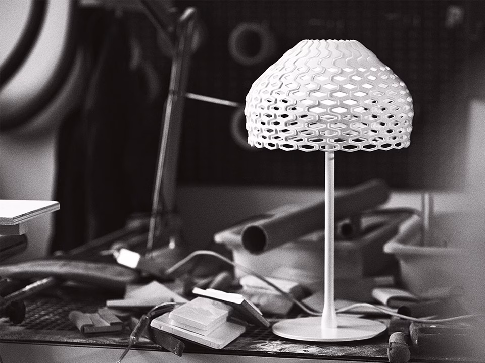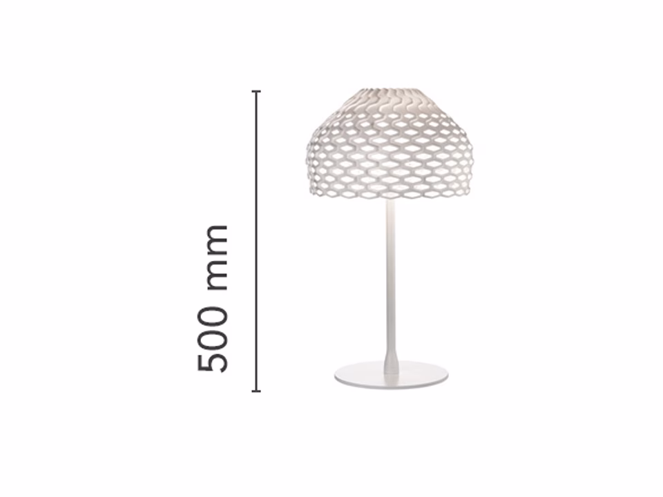 Diffused light table lamp. Exterior diffuser in Polycarbonate. Internal diffuser in injection printed opal polycarbonate. Support and base in painted steel.
