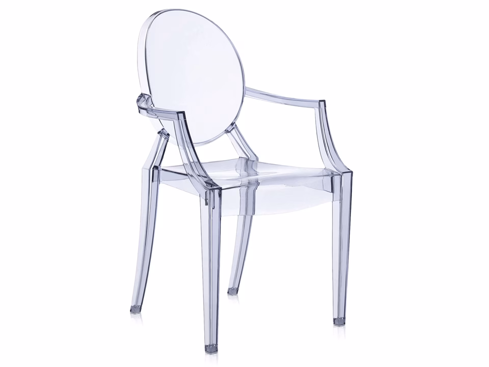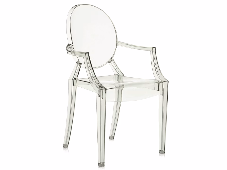 A comfortable armchair in transparent and coloured polycarbonate in the Louis XV style, it is the quintessence of baroque revisited to dazzle, excite and captivate. Louis Ghost is the most daring example in the world of injected polycarbonate in a single mould. Despite its evanescent and crystalline appearance, Louis Ghost is stable and durable, shock and weather resistant and can also be stacked six high.