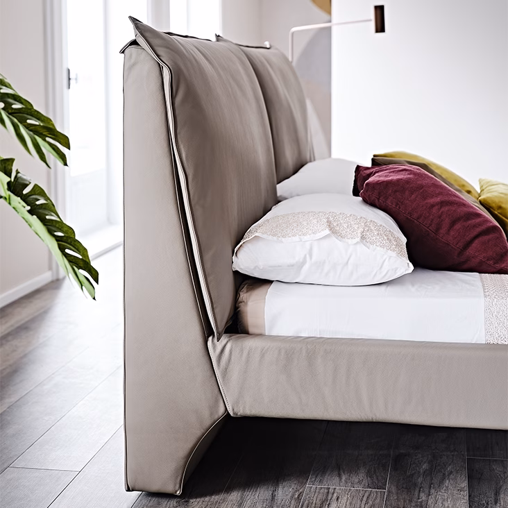Upholstered bed covered in fabric, synthetic nubuck, micro nubuck, synthetic leather or in soft leather as per sample card. With chromed (08) steel feet. Headboard with cushions. Slats included.