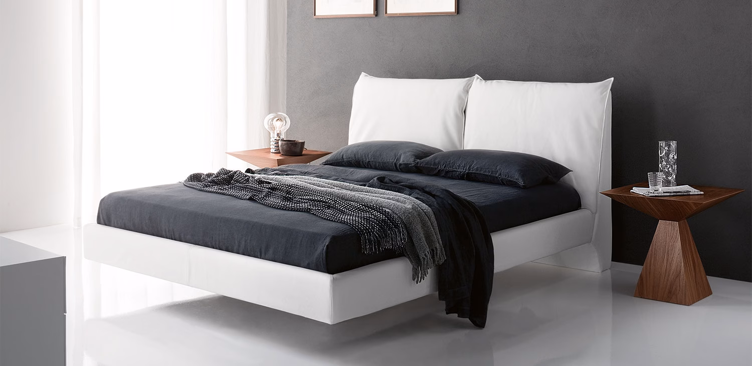 Upholstered bed covered in soft leather as per sample card. With chromed (08) steel feet. Headboard with cushions. Slats included.