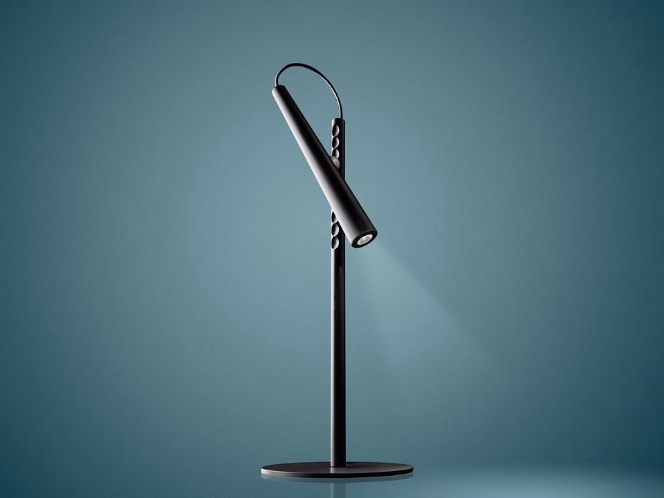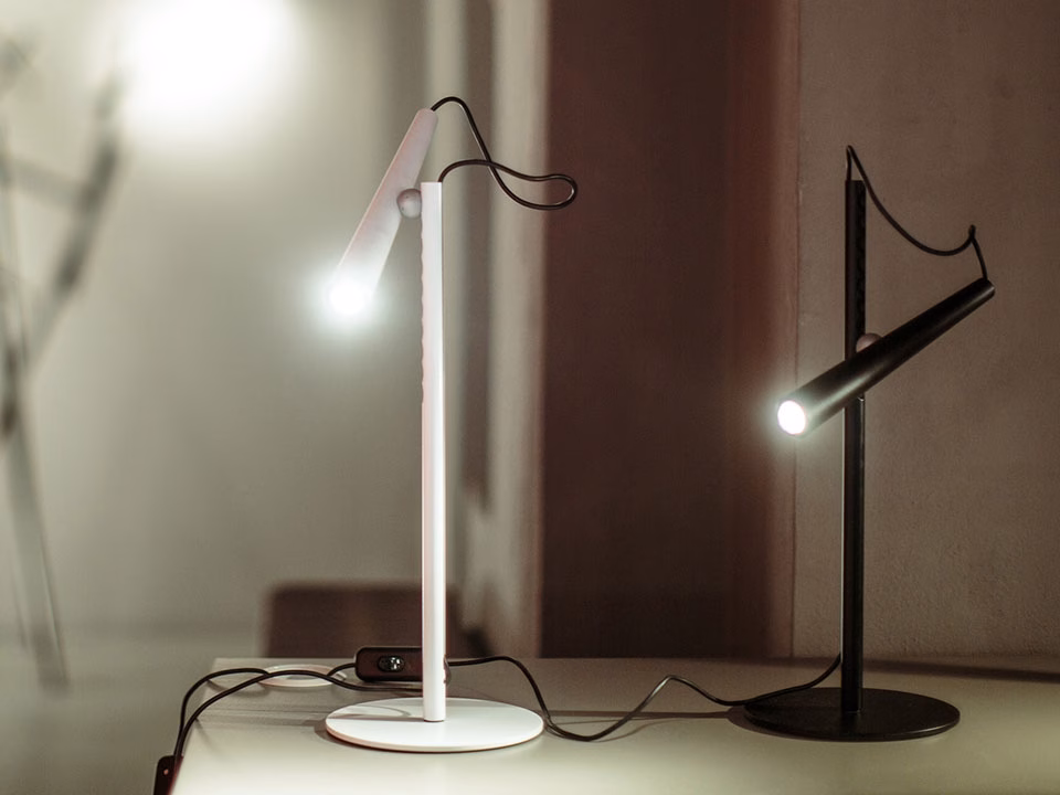 A table lamp with an elemental and bold look. The invisible force of a magnet joins the supporting rod to the illuminating body, allowing you to direct the light cast by Magneto at leisure, just like a torch.
