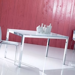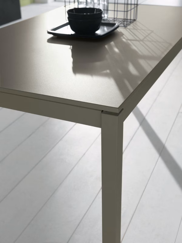 Table with extension and lacquered metal frame in many colours. Top in melamine, laminate Fenix, scratch-resistant Unicolor, gloss glass or velvet matt anti-scratch glass