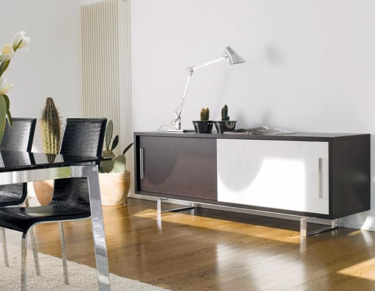 Sideboard with sliding doors in painted tempered extralight glass. Wooden or lacquered wood frame. Option with drawers in wood or lacquered wood also available. Size: |