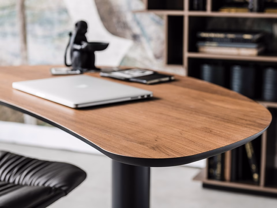 Desk with base in graphite (GFM69) or black (GFM73) embossed lacquered steel. Top in Canaletto walnut (NC) or burned oak (RB).