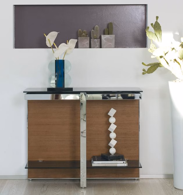 Console with chromed steel frame, 2 extralight tempered painted shelves, 2 swivel chromed steel drawers. Wooden or lacquered wood back panel.