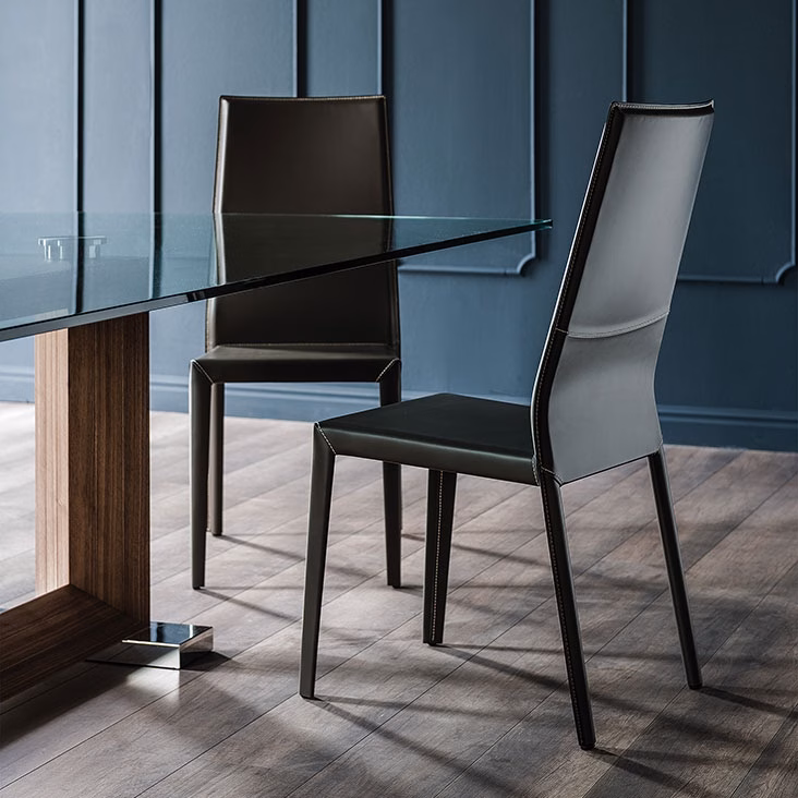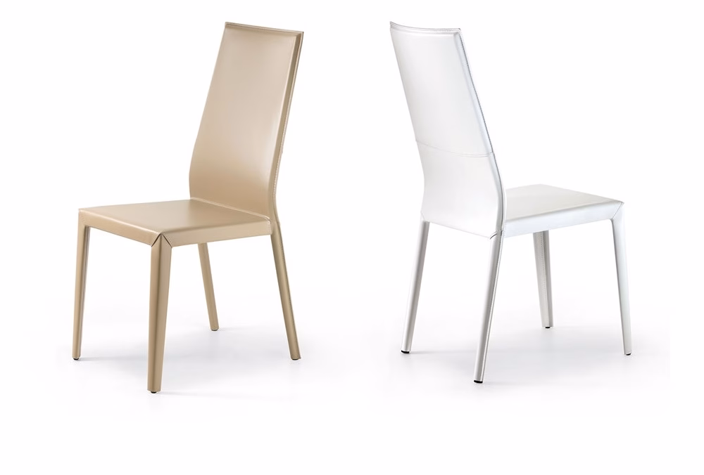 Chair with metal frame covered in leather as per sample card. Standard or in contrast stitching.