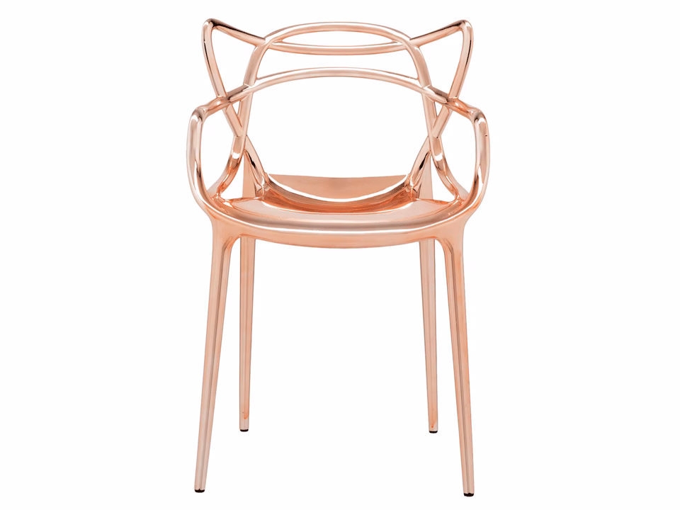 The Masters chair is a powerful tribute to three symbolic chairs, re-read and re-interpreted by the creative genius of Starck. The unmistakable silhouettes of the “Series 7” by Arne Jacobsen, the “Tulip Armchair” by Eero Saarinen and the “Eiffel Chair” by Charles Eames are interwoven into a sinuous hybrid giving life to a fusion of original and engaging styles.