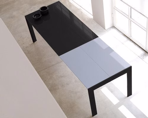Telescopic sliding rail system allows 1 meter of extension. Wheeling system that allows the legs slide. Tempered laquered glass top.