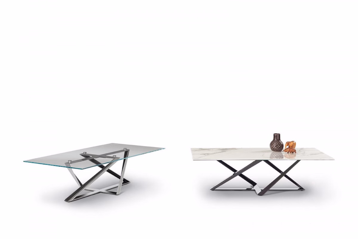 Coffee table with lacquered metal frame. Top in veneer wood, glossy glass, velvet matt anti-scratch glass or SuperMarble.