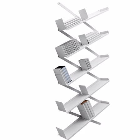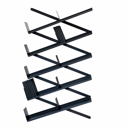 Steel plate frame, shelves and bookends in metal sheet. Finishes: matt white lacquered, matt black lacquered. The pantograph frame allows a free bookcase position on the wall, to satisfy aesthetical and space requirements. Size: |