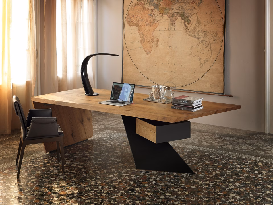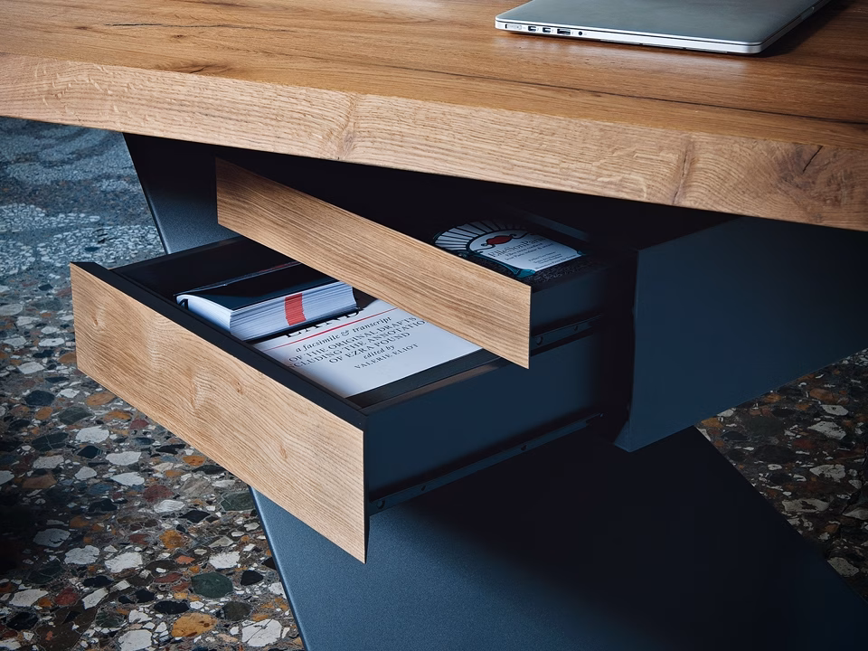 Desk with drawers in Canaletto walnut (NC), Heritage oak (HR) or open pore matt black (OLM73) Elm. Leg in graphite (GFM69) embossed lacquered steel. On version 215 x 100cm the drawer can be fixed on both sides of the desk, on version 260×120 it can be fixed only facing the shortest side.