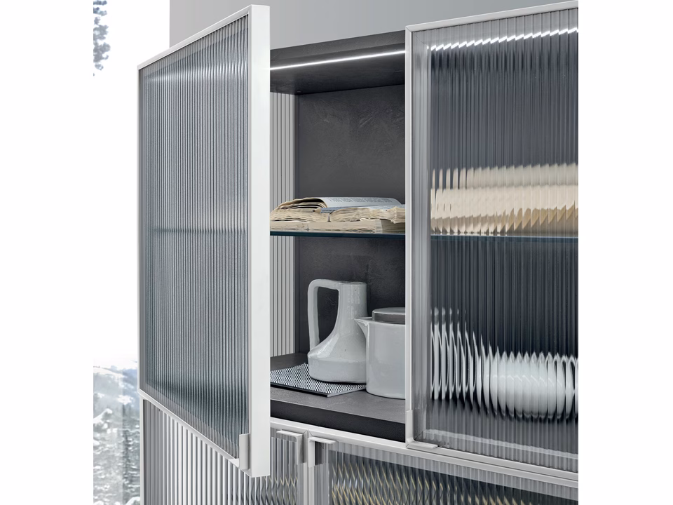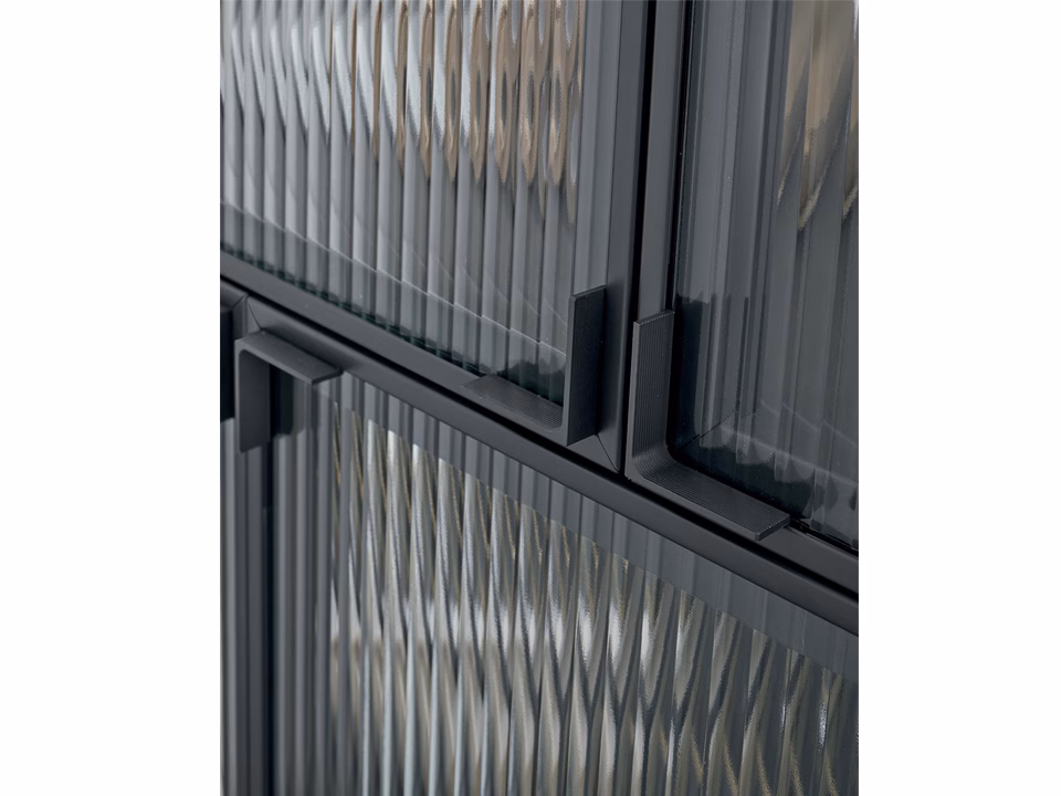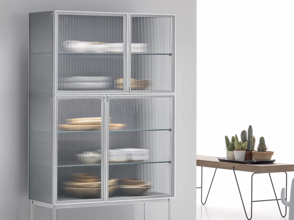 Nina sideboard. The metal structure and reeded glass distinguish the Nina sideboard, turning it into a vintage-style glass display cabinet.