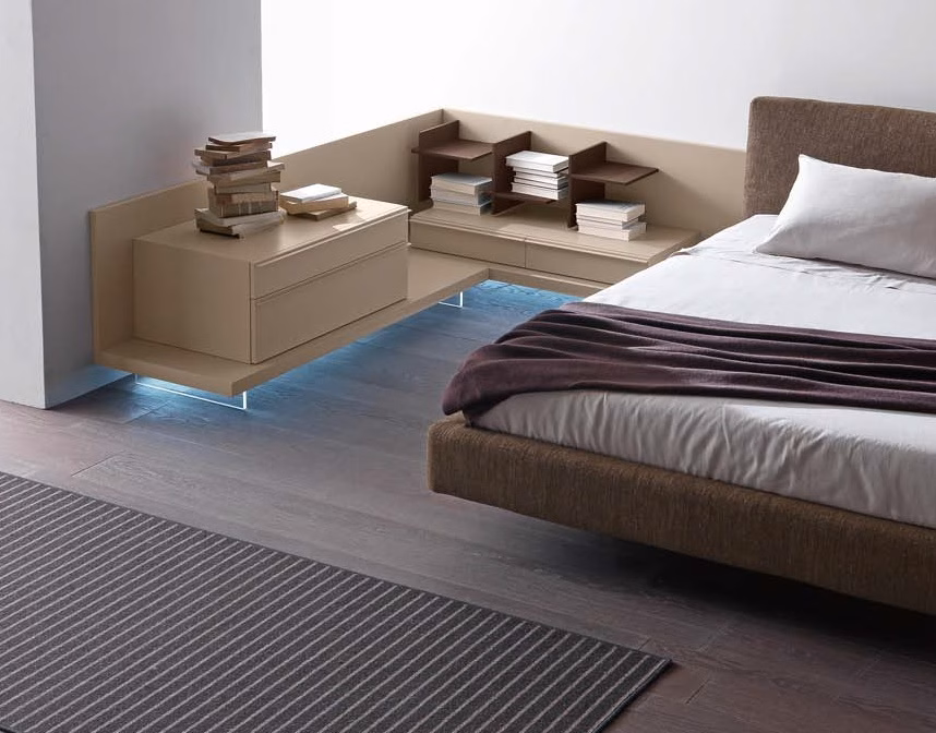 Soft closing drawers, coloured wood, glass or matt lacquered finishes in various colours.