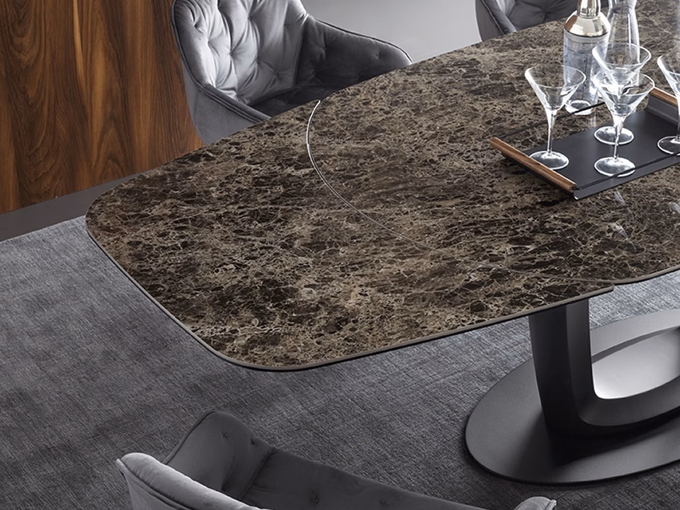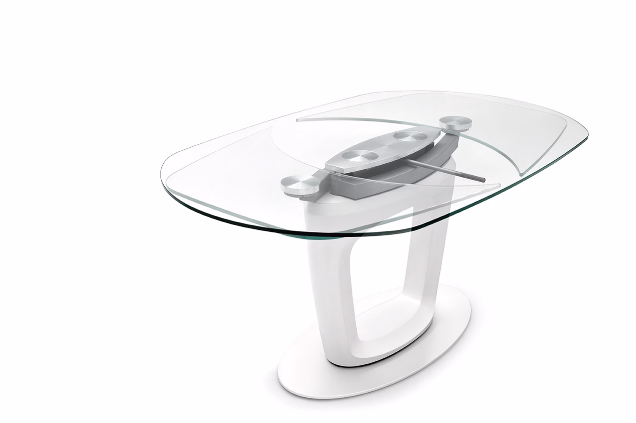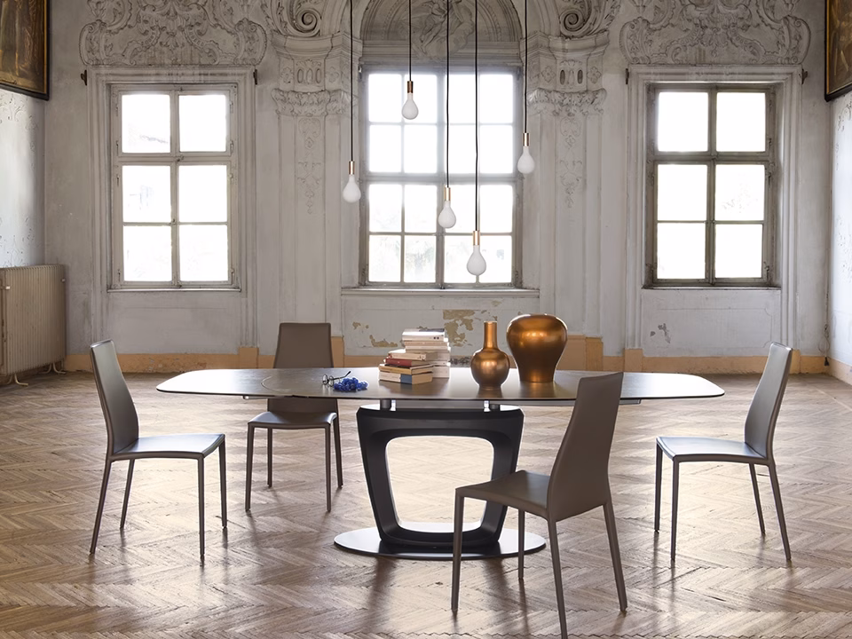 The ORBITAL table has a technologically advanced automatic extending system. Thanks to one fluid movement of its metal arms, the two extension leaves slide out from underneath the ceramic top and simultaneously position themselves at the same level, maintaining the table’s elliptical shape. A locking device prevents accidental closure. The pedestal base in rigid polyurethane, with a large central hole, and the metal support plate ensure the frame’s stability. ORBITAL is a high-tech, design savvy extending table, a scenic presence in your domestic ensemble, the true protagonist of your dining room.