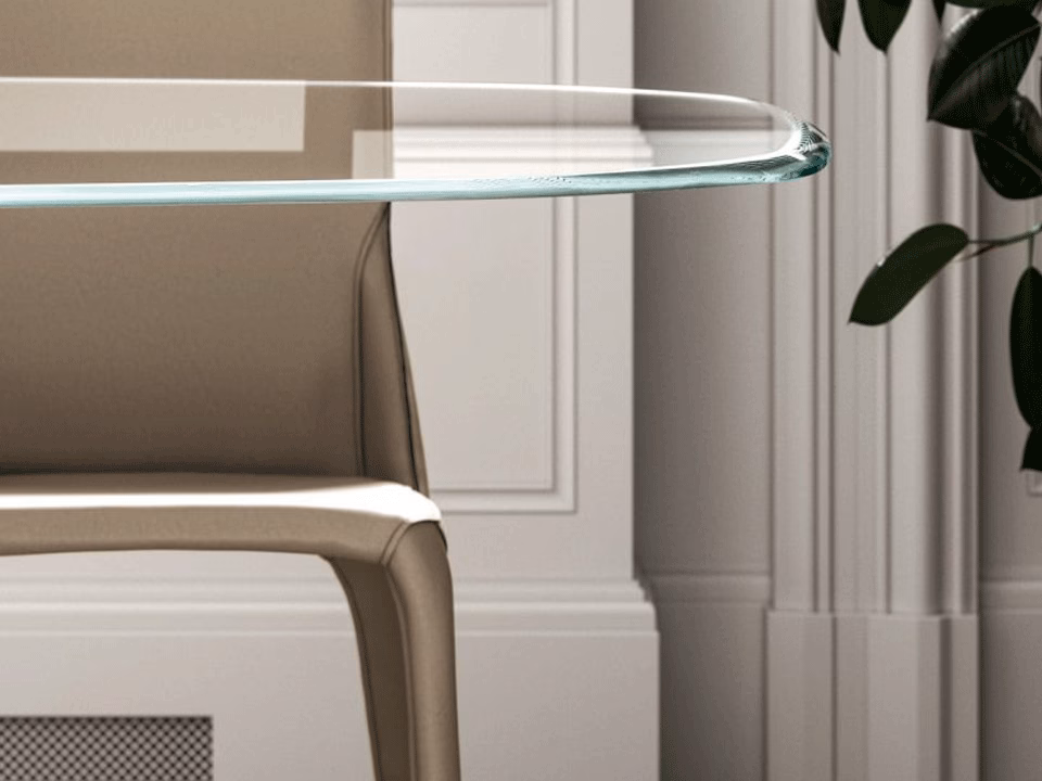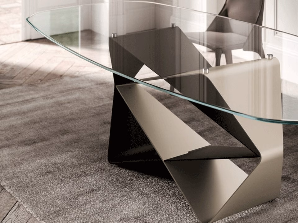 The simplicity of the different glass tops of the Gem table, with a double shaped bevelled cross grinding edge and a straight ground polished edge, highlight the essential dynamism of the metal base in a double chromatic nuance or single colour. The powerful geometric interlocking of the metal base attracts the attention of the living and gives this furniture a unique personality.