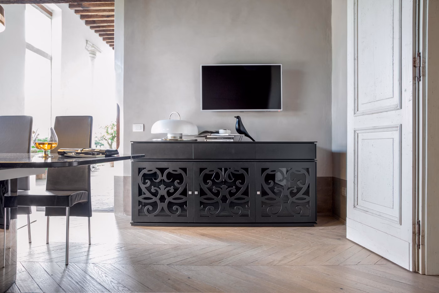 Colour-changing and luminous, just like the city it takes its name from, Paris is a system that reveals glass and wood’s discrete luxury, in a multitude of shapes: sideboards, TV stands, showcases, hanging units and shelves, composed in your preferred finishing.