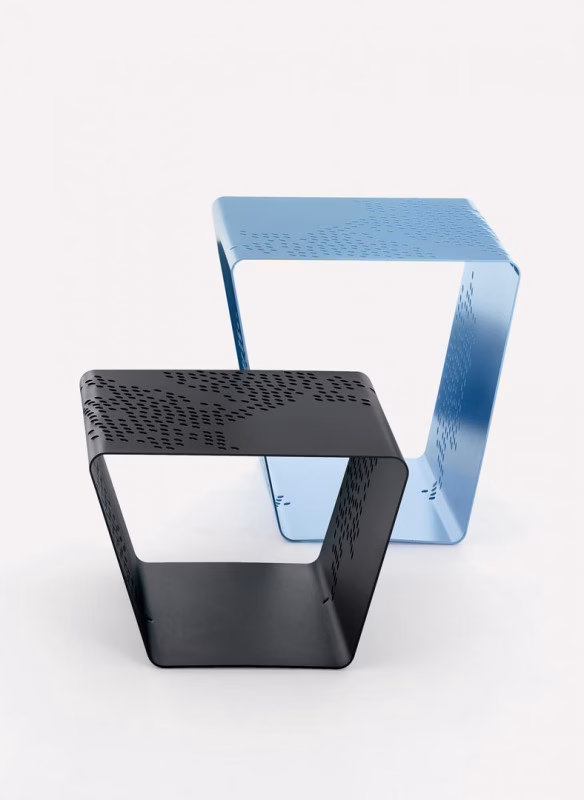 Coffee table/ottomans/magazine rack in patterned lacquered metal frame.