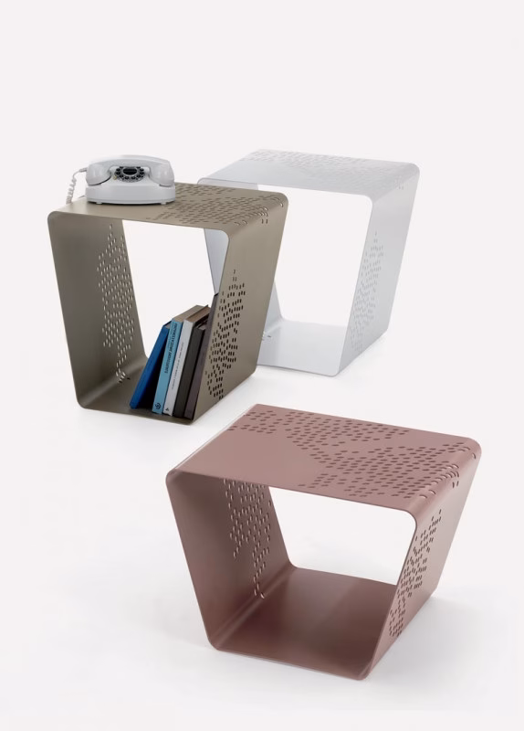 Coffee table/ottomans/magazine rack in patterned lacquered metal frame.