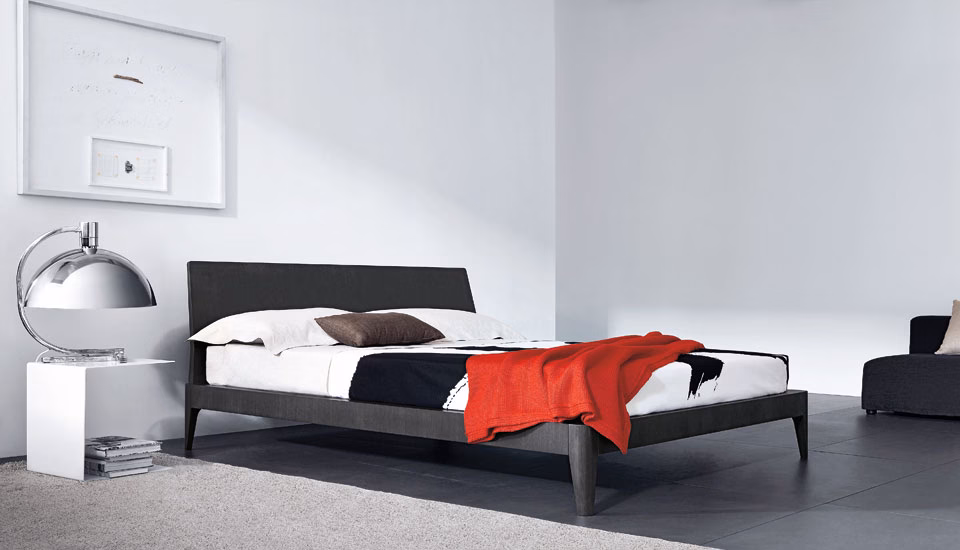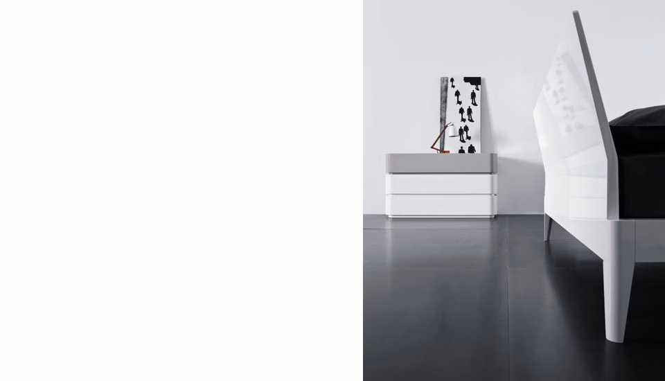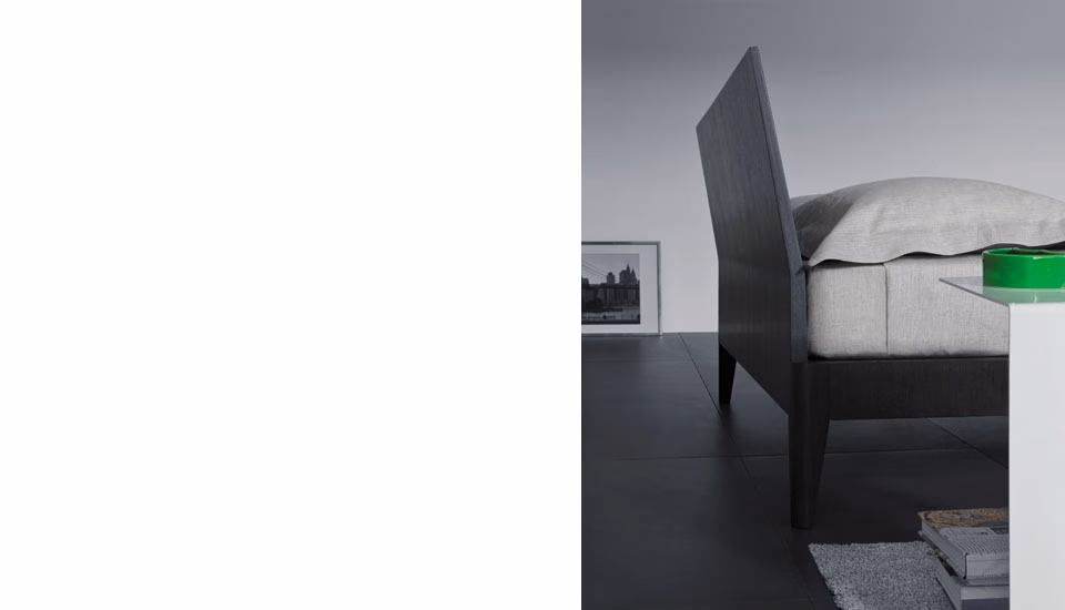 Symmetry and simplicity create a reassuring yet eclectic design. Clean-cut volumes, seamless surfaces, slim and rounded profiles are part of an expressive language that communicates solidity and modernity. The feet, resembling elegant, slim heels, become fascinating distinctive features. For a warmer, more sophisticated version, the headboard and bed frame can be upholstered in fabric or leather. Even the bed’s frame can be customised in many ways: it is available matt lacquered as well as in wood.
