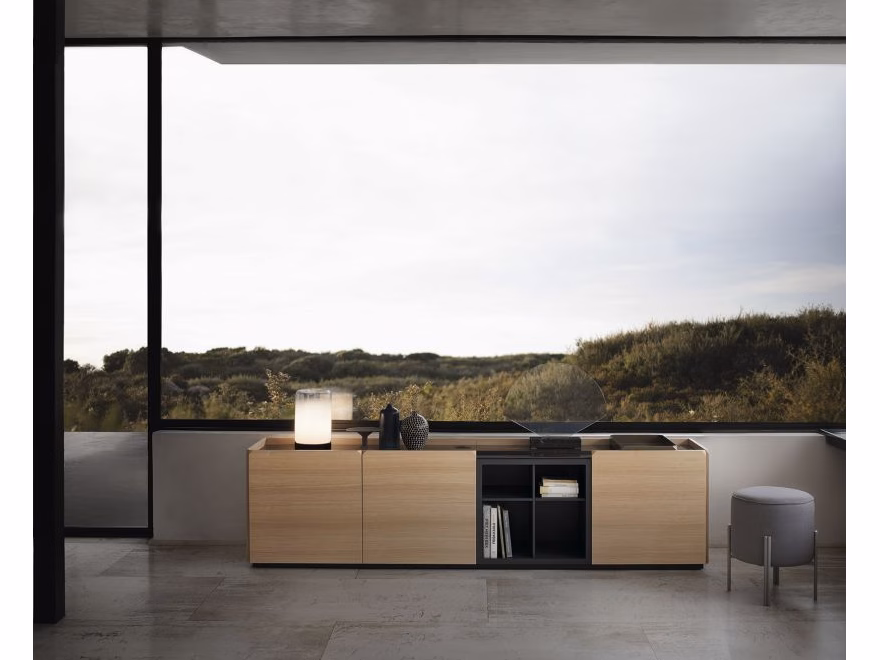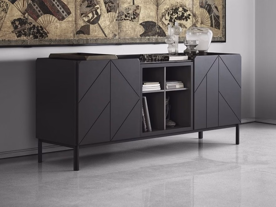 Wooden sideboards with hinged doors and open spaces, side panels and doors in lacquered decorated wood, top to choose.