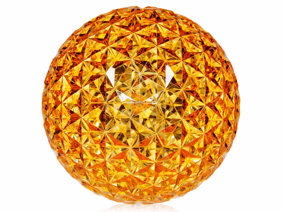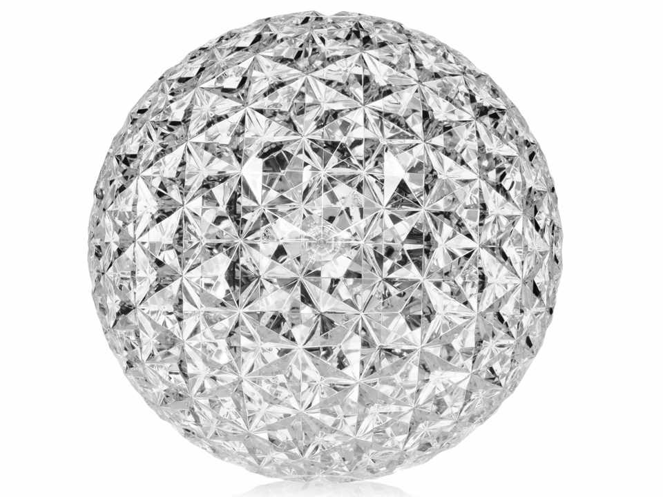 A complete family of lamps (pendants, low table lamps, and lamps with metal structures) its special feature is the shape of its slightly elliptical diffuser. Its transparent surface, which is many-sided both inside and out, creates a rich tapestry of reflections.