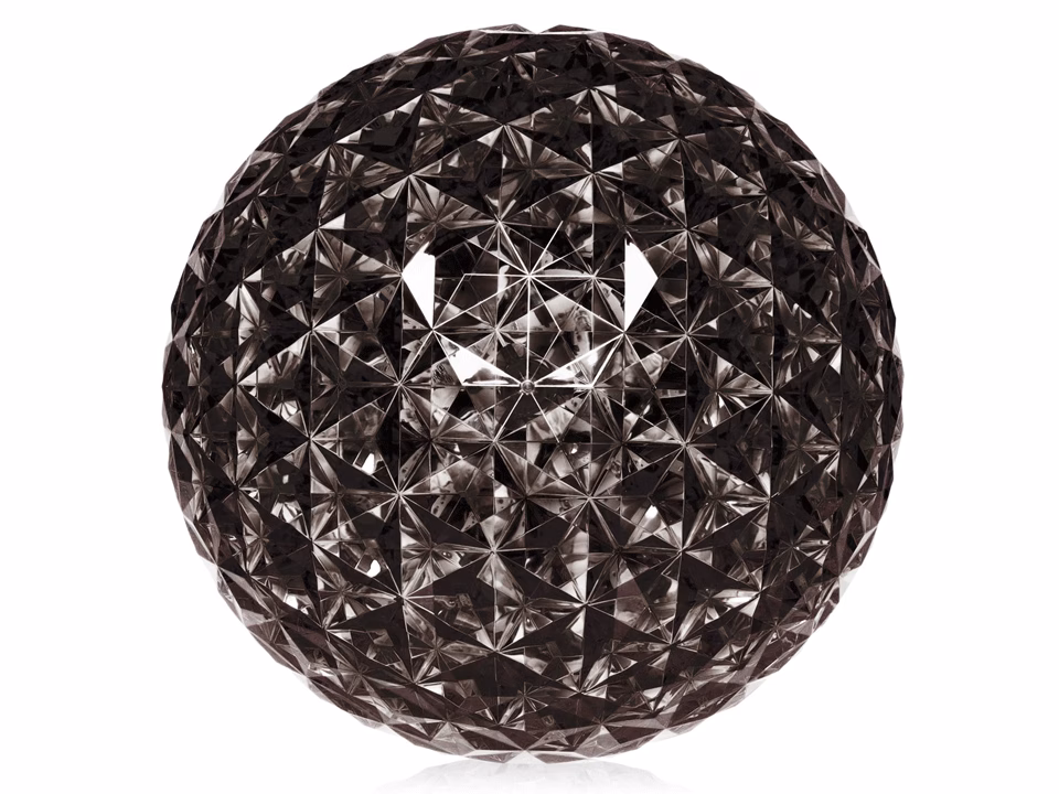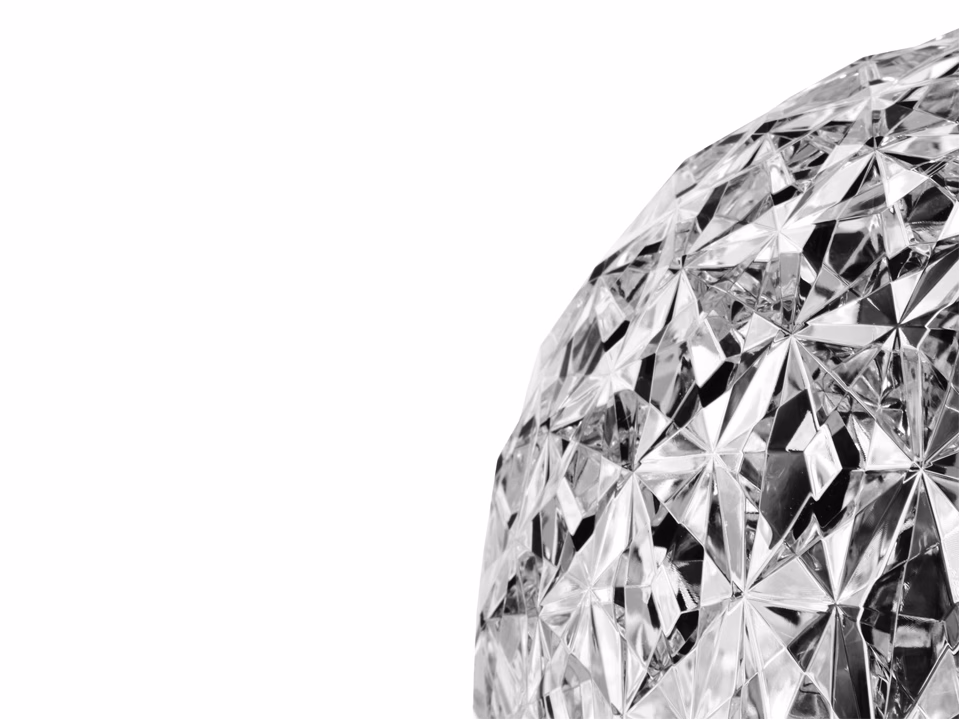 A complete family of lamps (pendants, low table lamps, and lamps with metal structures) its special feature is the shape of its slightly elliptical diffuser. Its transparent surface, which is many-sided both inside and out, creates a rich tapestry of reflections.