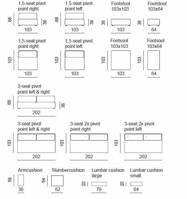 3 seat pivot point right or left or left and right: W 2020 x D 1030 x H 680mm