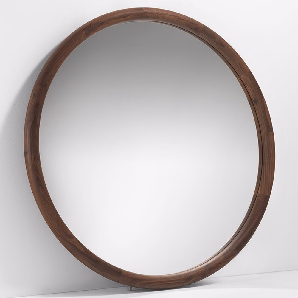 Round wall mirror to be hang or to be leant with frame in solid canaletta walnut. It is compulsory removing the support feet to fix the mirror to the wall.