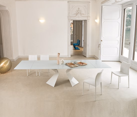 Available in black painted glass, extra light glass painted white, acid treated black glass and extra light glass acid treated white. (Acid treated means that the surface of the table has a matt frosted finish, whereas the painted finish has the standard glossy top) Painted steel legs in black or white. Sizes: |